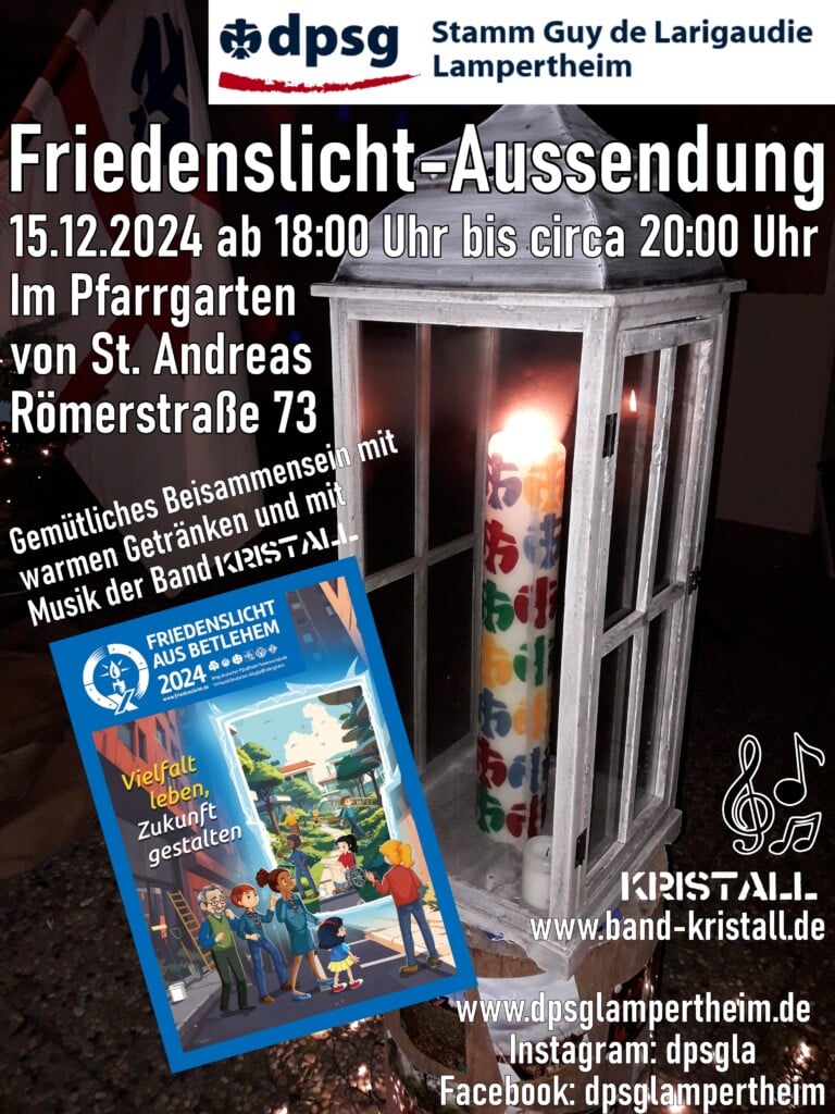 Das Friedenslicht aus Bethlehem hat seinen Weg nach Lampertheim gefunden. Mit einer feierlichen Aussendung am dritten Advent sorgten die Lampertheimer Pfadfinder des Stammes Guy de Larigaudie für einen stimmungsvollen Adventsabend. Die Pfadfinder brachten die kleine Flamme der Hoffnung direkt aus dem Dom zu Mainz nach Lampertheim. Gefeiert wurde dieser Gottesdienst mit einem vollen Dom. Bischof Peter Kohlgraf freute sich sehr, denn es sei mindestens genauso voll wie zu den Weihnachtsgottesdiensten. Das sei ein Zeichen, das es sehr viele Menschen nach Frieden sehnt! Am Abend kamen zahlreiche Menschen zur Aussendungsfeier im Pfarrgarten von St. Andreas. Bei Bratwurst und wärmenden Getränken holten sich viele Lampertheimer das Licht nach Hause, um ein Zeichen des Friedens und der Verbundenheit zu setzen. Musikalisch wurde der Abend stimmungsvoll von der Band Kristall begleitet, deren Klänge die Botschaft des Friedenslichts untermalten und die Herzen der Anwesenden erwärmten.